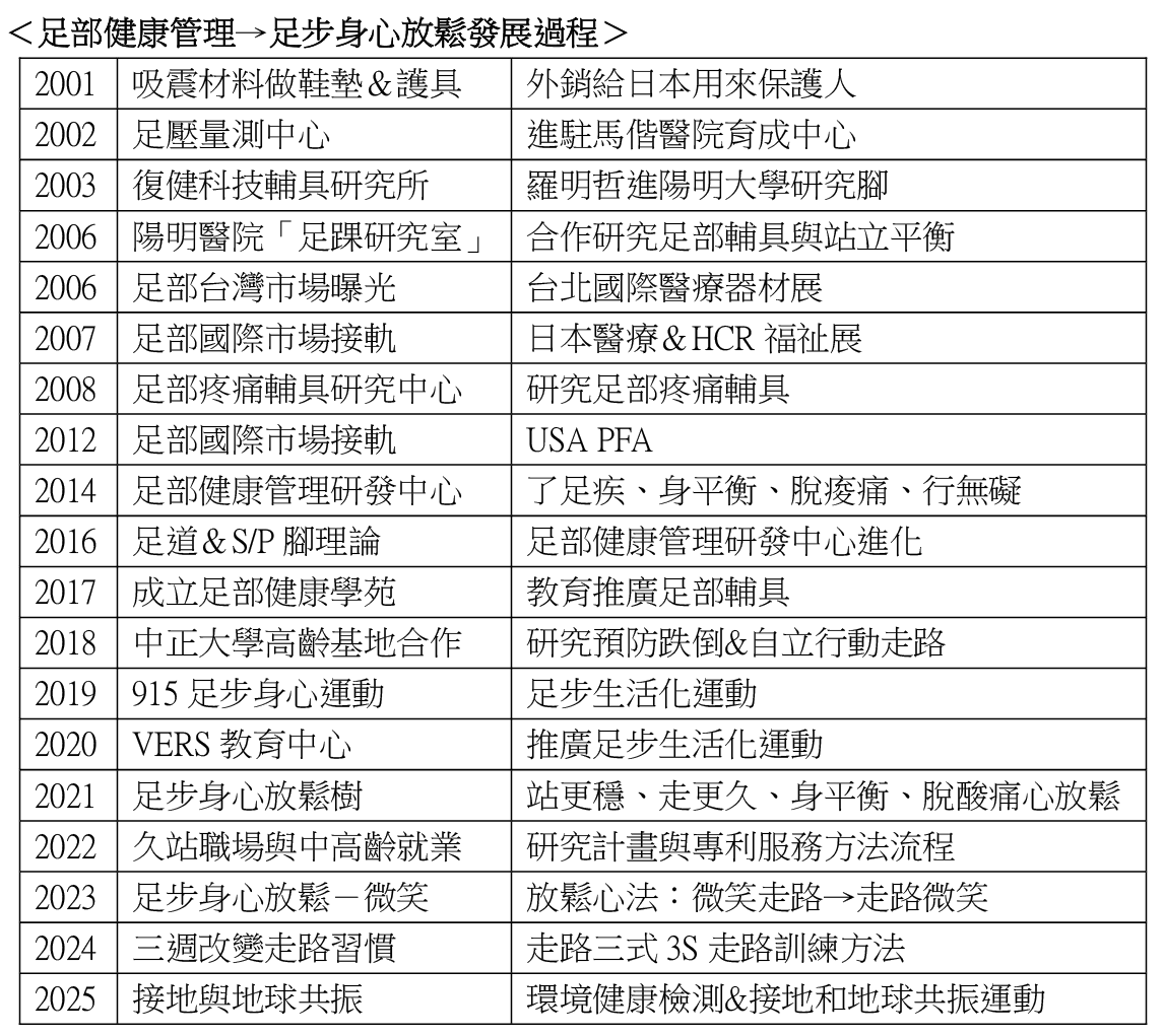 2018年與國立中正大學高齡研究基地的合作過程中發現,走路功能對於長照的重要性。也發現階段性的由足部量測探索健康風險,再運用足部輔具,可以讓高齡或失能的人能站更穩走更久,並促進在地中高齡人員的就業機會,與職場促進健康。因而,我們聚焦心力研究如何幫助中風、小兒麻痺、腦麻、小腦症、帕金森症、膝蓋退化的個案,能夠站更穩走更久的方法,而服務過程中也出現讓大家感動的奇蹟故事